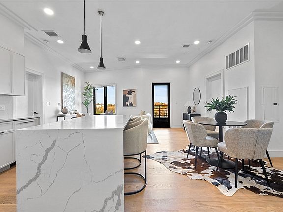 Stand-in glass showerQuartz waterfall islandSpa-like bathMarble tileOak hardwood flooringBrass brizo fixturesCommon roof deck