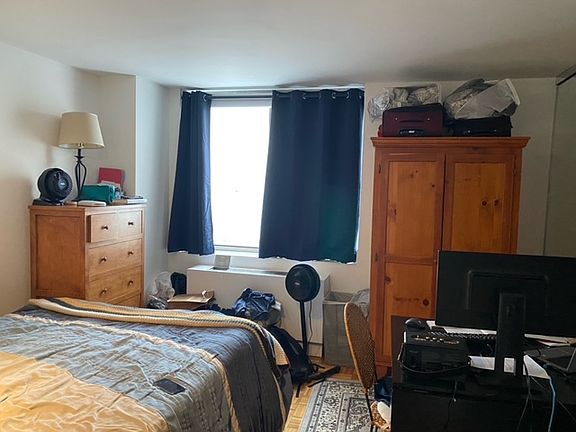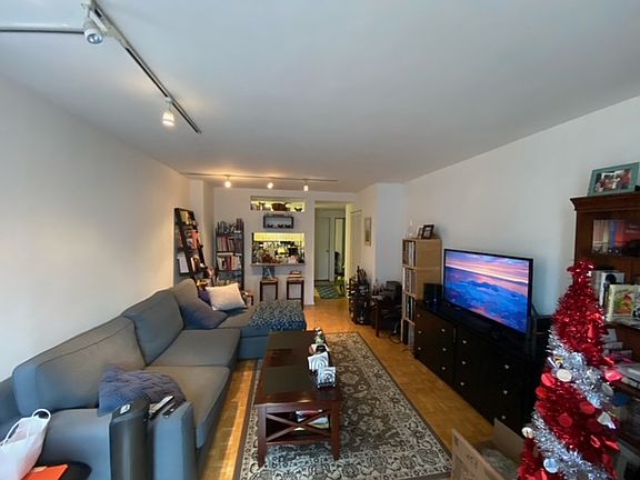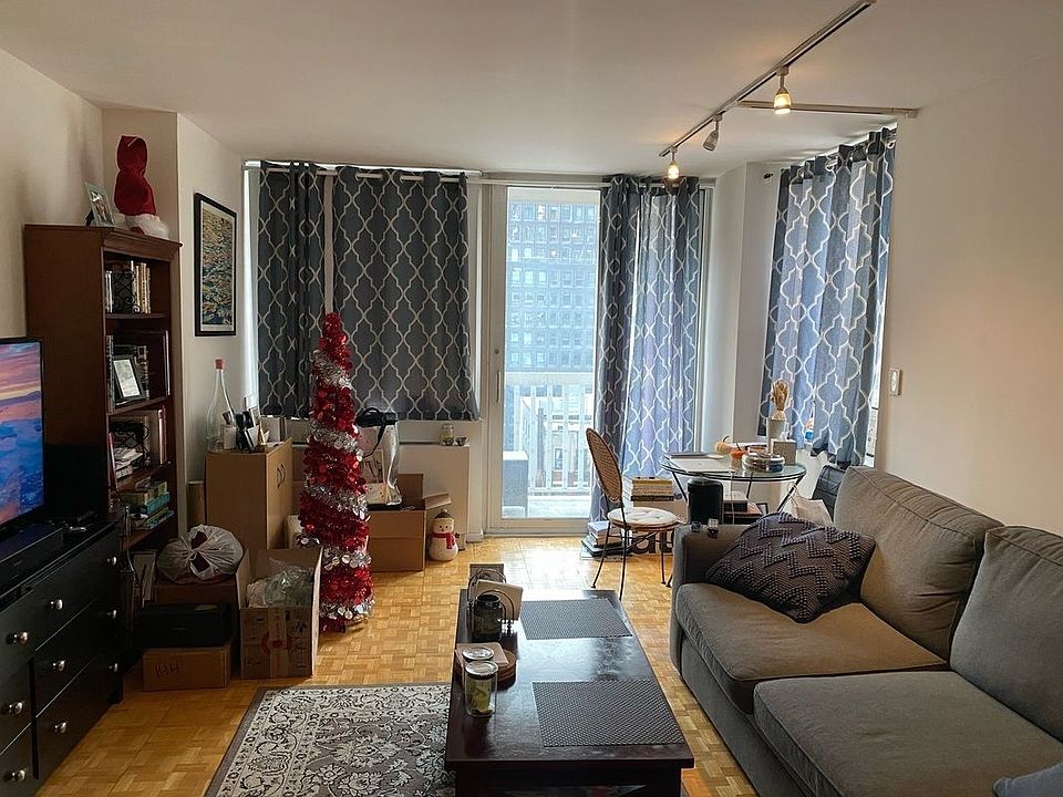 Corner unit on high floor with amazing southern views from the balcony off the living room. Bedroom faces north and comfortably holds a king sized bed, dresser and desk. One closet runs the entire wall and there's a walk-in, plus three others throughout the unit. One full bath is connected to the bedroom and second bath is separate from the living room. Kitchen has fridge, gas stove, microwave, and dishwasher. Building is full-service with 24 hour doorman, gym, sauna, pool, laundry and amazing roof deck (amenities are included in rent) .