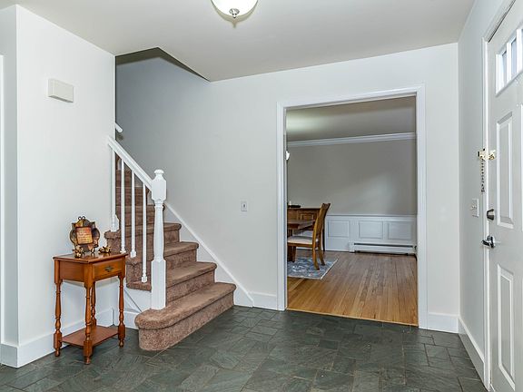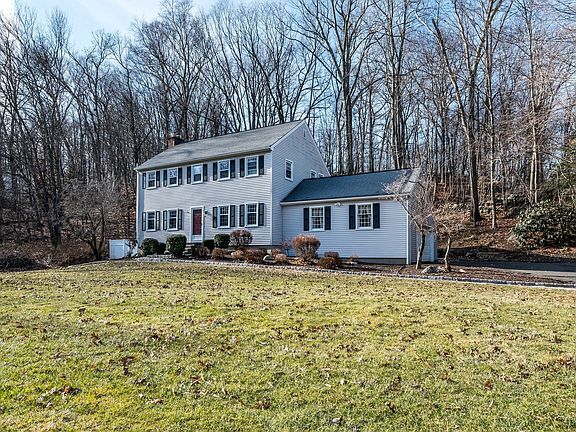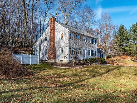 Your zen oasis is just an easy commute away. Large flat front yard for play with tranquil private woods in back. This 4 bedroom 3,260 sq ft Salt Box Colonial main level features a sizable formal living room with custom molding and brick fireplace, tasteful dining room and bright eat-in kitchen that opens to an inviting family room featuring a cozy wood-burning stove and exposed beams. From the kitchen you walk out to a large deck with gazebo perfect for outdoor entertaining or a private peaceful breakfast. Upstairs highlights a large master bedroom with unique master bath en suite, 3 more nicely sized bedrooms, a full bath and new carpeting throughout the entire upstairs. The lower level is finished with room for an office, gym and play area. Hurry, it won't last long.