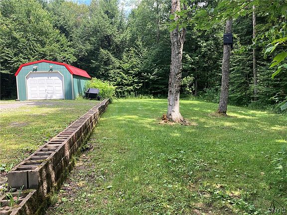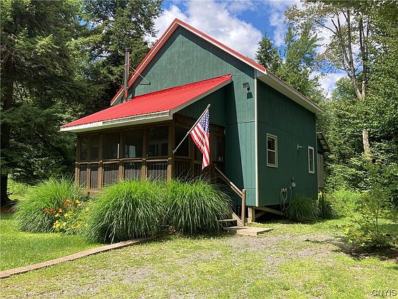 This 2-story cabin is the perfect place for rest & relaxation on a private road. Main floor has a screened porch on the front for hanging out, livingroom, full bathroom, and large kitchen. Plus the back covered deck is perfect for grilling & gathering. Upstairs has 3 bunks & room to sleep 6-8. Wired for satellite; water non-potable. ATV trails around property with direct access to Oswego Cty ATV Trail System. Kids rope course, zip-line, slide & swing throughout woods. Outdoor shower on back deck. Propane stove and on-demand hot water. Covered front screened porch in summer has plastic panels in winter. Electric in garage with powered door. Rear property line partially borders Stave Mill State Forest. Approx 1mi to snowmobile trail; 2.5mi to Salmon River Reservoir. Includes beds, couches, table, grill, along with some, not all, household items.Please ask. All offers in by NOON on TUES, AUG 15, 2023, for presentation to sellers that evening.