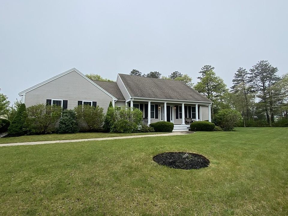 Executive style contemporary ranch located in Pilgrim Pines.This home exudes curb appeal; situated on corner lot w/inviting farmers porch, 16x12 composite deck, fenced back yard, & mature landscaping. Spacious open floor plan w/cathedral ceiling living room, gas fireplace, hardwood flooring, slider to deck. Gorgeous entertainers kitchen features maple cabinets wi/rich cherry color, granite counters, tile back splash, octagon center island, &bump out dining area. Private master suite off kitchen w/vaulted ceiling, master walk- in closet, newer gray hardwood flooring & beautiful chandelier. Private master bath w/ double vanity solid surface counters, tile floors, tub /shower. Low maintenance vinyl siding, natural gas heat & hot water on demand, newer high efficiency ac condenser 2014.Full unfinished basement offers tons of storage. Nearby downtown Buzzards Bay offers awesome new restaurants, hotel, park, Cape Cod Canal, easy highway way access. Love where you live. Live where love.