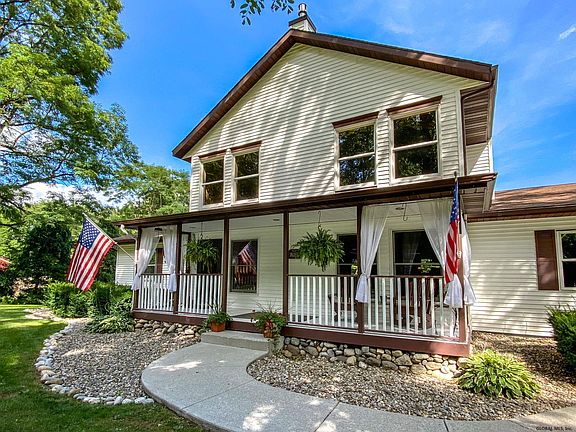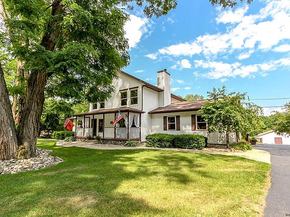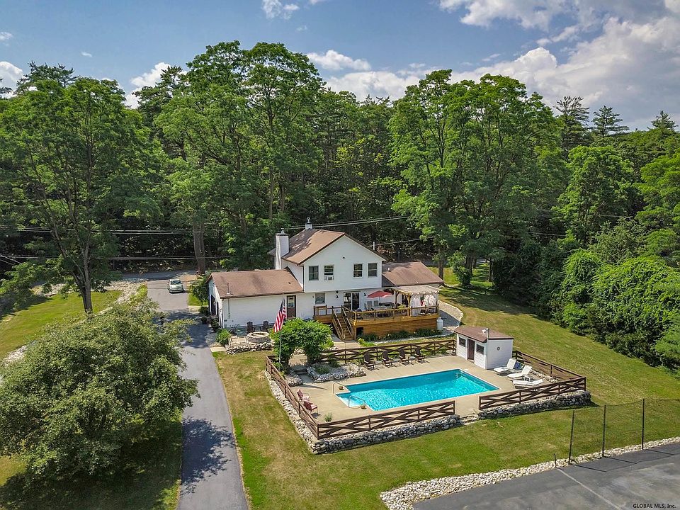 JUST REDUCED! Park-like setting with pond on 6.54 acres. This home has 5 Bedrooms and 3 bathrooms, Stone Fireplace in Great Room, Kitchen with breakfast bar and dining area, 2 first FL bedrooms and a laundry room. 2nd Floor Master suite. Walk out basement with living room and dry bar, with full bathroom and bedroom. Gorgeous deck from the first floor that overlooks the patio and inground pool with pool house. Attached garage, with paved driveway to a barn and another garage. Paved sport court, lush green grass, pasture side yard, plus a fish stocked private pond on the property. Nicely landscaped with stones and plants. Currants and blueberry bushes next to the barn. Auto Generator & solar panels to run entire property. Located directly across from state park. Easy access to I-87.