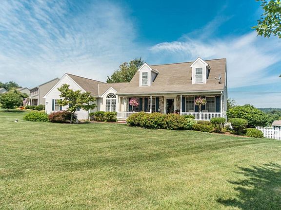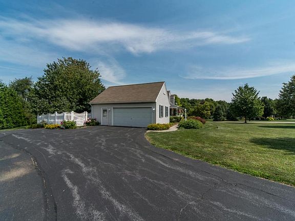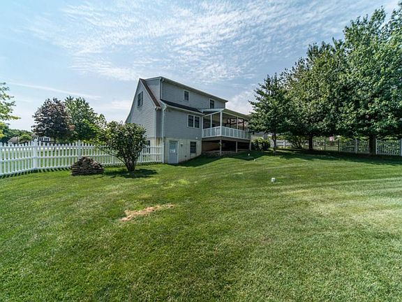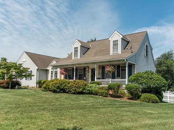 Cape Cod w/open floor plan, great room w/stone fireplace w/gas logs. First floor master, walk-in closet, bath has jetted tub & shower stall. Covered porch with beautiful farmland view. Open deck. Mature landscaping. New carpet. Large corner lot with beautiful white fence. Bright kitchen with skylight has vaulted ceiling & lots of cabinets & counter space. Chimney for wood pellet stove in walk-out basement which is ready to finish.