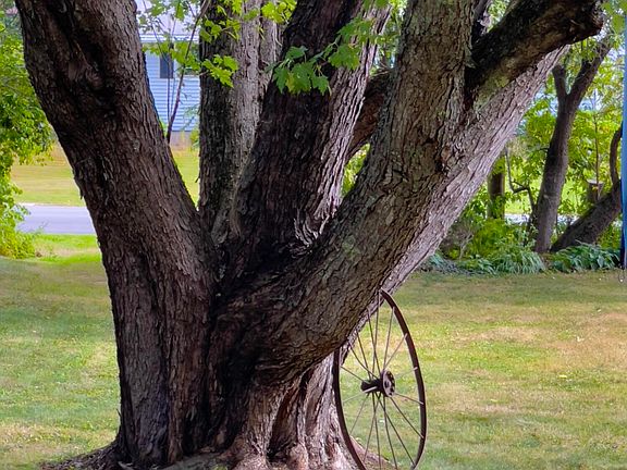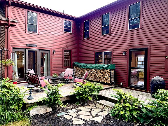 Large backyardWood stoveGlass-surrounded patio doorPrivately located primaryCustom cabinetryHandsome stone wallsAttached barn