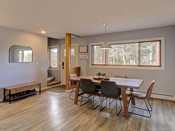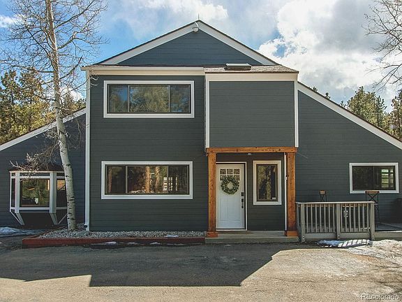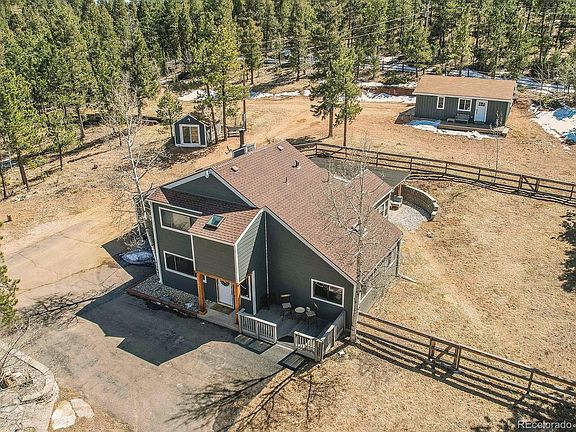 Stunning mountain retreat! Nestled in Woodside Park, a Firewise community offering breathtaking snow-capped views and ultimate privacy. Set on 4.43 usable acres, this south-facing property is 98% fenced and provides easy access to Highway 285 while maintaining a secluded feel at the end of a cul-de-sac. Located just minutes from Elk Creek Fire Station, grocery stores, schools, and charming local coffee shops and eateries, this Hardie Board covered home offers both convenience and serenity. Inside, the open-concept layout creates a seamless flow between the main living areas. The kitchen boasts vaulted ceilings, a woodstove, and a center island, making it perfect for entertaining. The spacious family room includes an infrared heater and provides access to a versatile storage room with endless possibilities. Enter the heated sunroom, which leads to an incredible outdoor patio, expanding the living space into the natural surroundings with wildlife. The upstairs primary suite features its own private bath and an unfinished storage area, while the main level offers two additional bedrooms and a full bath. Outdoor living spaces are thoughtfully designed to enhance the mountain experience. A new flagstone front patio includes a powered greenhouse/shed, a new retaining wall, a light fixture. The updated volcanic rock water feature comes with a remote-controlled pump. The stone back patio is highlighted by a large, powered awning and lit pergola, a retaining wall, and a fenced dog run. The property includes a recent conversion of a pole barn into an oversized two-car garage with its own 30-amp electric box, 220V for EV charging, grounded new electrical with lightening protection on all buildings. A renovated shed has been transformed into a detached office with insulation, drywall, and power. A motorized, solar-powered entry gate provides secure and convenient access. For equestrian enthusiasts, Woodside Park offers access to trails and a community horse arena.