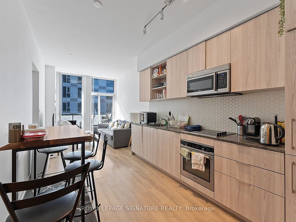 Loft-Style 2+1 Bed 2 Bath Suite with Parking at Playground Condos! One of only a handful of units in the building with this exclusive floor plan! Featuring soaring 9.5 ft ceilings, engineered hardwood floors & floor-to-ceiling windows. Spanning over 835+ sq ft, this super efficient floor plan with a lengthy concept living & dining space is perfect for entertaining, hosting & lounging! Enjoy indoor-outdoor living at its finest with a walkout to the private sunset facing balcony. A chef-inspired kitchen with high-end, built-in, stainless steel Blomberg appliances, smooth granite counters & stylish geometric tiled backsplash. Delight in a plethora of white oak cabinetry, drawers & open-faced shelving. Retreat to the generously-sized primary suite with a walk-in closet, floor-to-ceiling windows, double-door closet & plenty of room to fit a work-from-home setup.The 5-star resort-style 3-piece ensuite features porcelain floors, a glass shower stall & granite vanity with under-sink storage. The super spacious second bedroom is rounded out by double-panel closet & glass sliding doors that double as a clever interior window. The 2nd bath ise qually as spa-inspired & complete with 4 pieces - modern porcelain floors, 2-in-1 shower/tub with glossy white subway tiled back splash & granite vanity with under-sink storage. The functional den is the perfect combination of open concept & separate, making the ideal home office, yoga studio or gym. Enjoy year-round fresh air on the covered private balcony with west views that span north, city-bound! Ensuite Blomberg Energy Star stackable washer & dryer. Highly-sought after parking spot included - there is a huge demand for parking in this building (+30 Ordnance St) with very little supply.