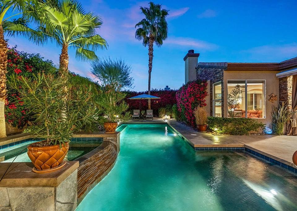 Welcome to your desert oasis in gated Lantana, where a grand double-door entry and atrium invite abundant natural light, highlighting 14-ft ceilings, earth tones, and travertine accent walls. Expansive slate floors create a gallery-like ambiance, with integrated lighting ideal for art display. In the living/dining area, remote-controlled brand-name blinds frame outdoor views, while a refinished fireplace adds a focal point. Step outside to one of the community's largest saltwater Pebble Tec pools and spa, with a soothing waterfall whose sound permeates the home. An electric awning and retractable sun screen help keep interiors cooler, as curated landscaping provides privacy. Enjoy the gourmet kitchen's granite counters and ample storage. The primary suite overlooks the pool and features an art niche, raised soaker tub, and walk-in shower. Upgrades include a new water heater, solar, electric car charger, and backyard misting system. Partially furnished, this 3BD/2.5BA layout wraps gracefully around the pool for seamless indoor-outdoor living. Near El Paseo's world-class shopping, fine dining, and Indian Wells, this prime desert locale continues to rise in appeal and value. Inside, it's a haven for artists and collectors--a rare work of art to add to your collection. View today!