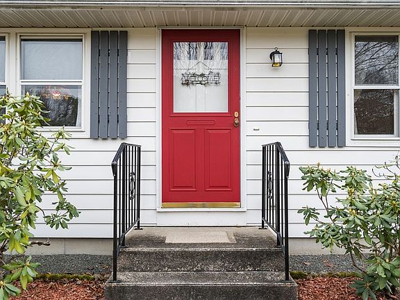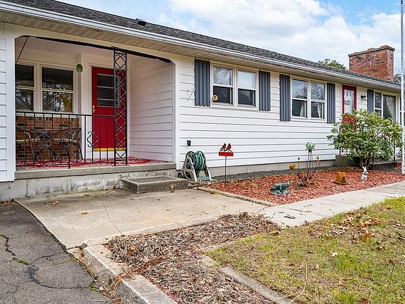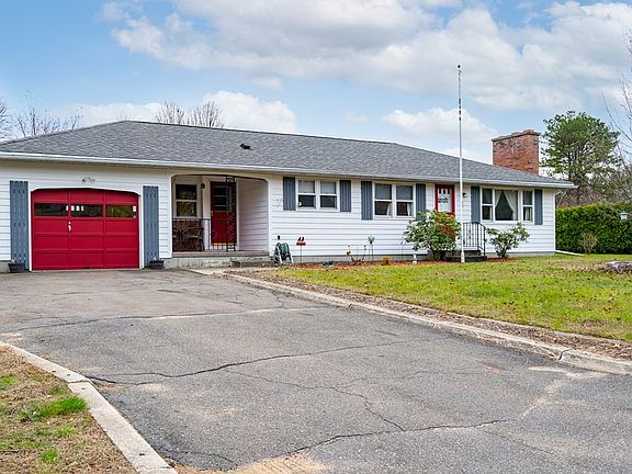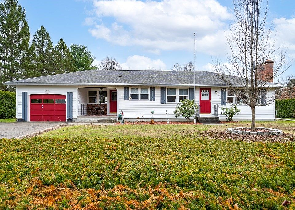 Spacious one story home with surprisingly large and spacious yard in fantastic location in great neighborhood close to cul-de-sac. The front porch leads to a large, heated breezeway and oversized one car garage with opener. The sunny and spacious eat-in kitchen opens to the large living room with hardwood floors and beautiful wood burning fireplace. Two generous bedrooms with hardwood floors, large closets and full bathroom complete the first floor. The basement is partially finished with second fireplace, laundry, 3/4 bath and lots of storage. The yard is a private oasis surrounded by arborvitae with hot tub and plenty of room of space for gardening or recreation. There is one storage shed with electricity. In addition, there is a detached 1 car garage with heat and electricity. This home is meticulous and lovingly cared for in desirable Easthampton.