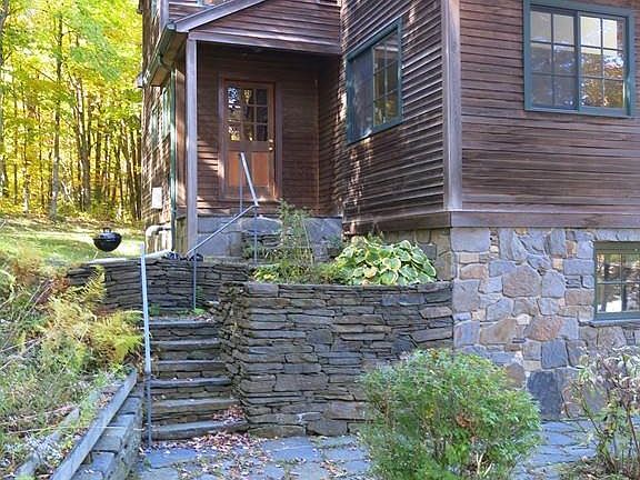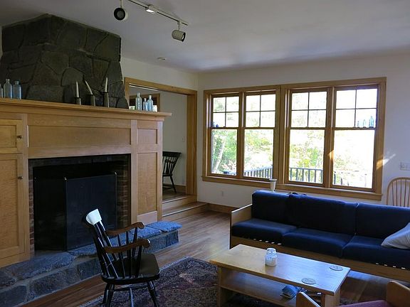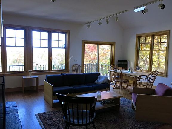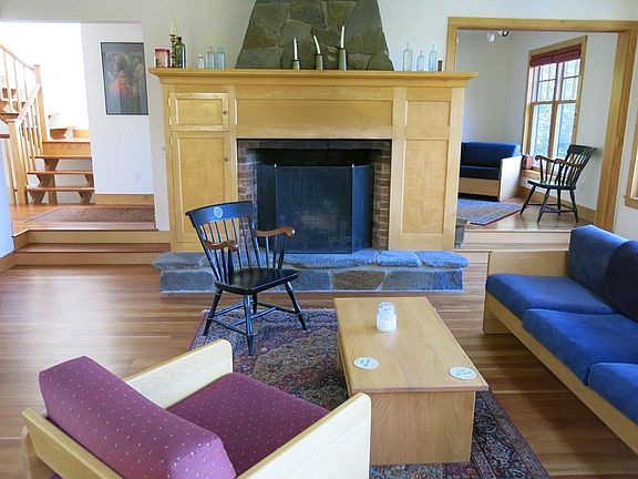 Light filled contemporary home has lovely views on the Old Cummington School for the Arts grounds. Beautiful cherry floors have radiant hot water heat underneath. Open floor plan in living area with kitchen, dining area and living area has a fireplace with maple mantel. Quality woodwork throughout. Kitchen has stone counter tops. Enjoy the fantastic view from the deck or large windows. Bedroom/ den has pocket doors so it can be either open or closed to the main living area. Full bath on this level. Top floor master bedroom has great views out its large windows, cathedral ceilings, large closets & a wood stove going into the Goshen stone chimney. A large soaking tub is in a corner of the room with skylights to see the moon. Lower level has a family room with a woodstove, sliders going out, a half bath , a laundry room and an entrance to the 2 car garage. Beautiful 2.9 acre grounds with hexagonal gazebo & beautiful stonework. 5 min. to Old Creamery Grocery