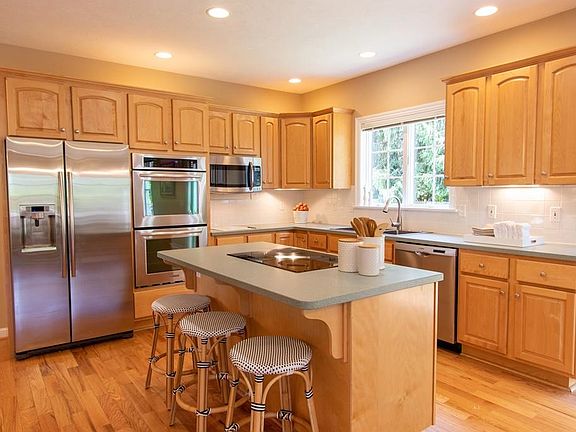 - Kit Dscrp: Flooring - Hardwood, Deck - Exterior, Kitchen Island, Open Floor Plan, Recessed Lighting, Slider