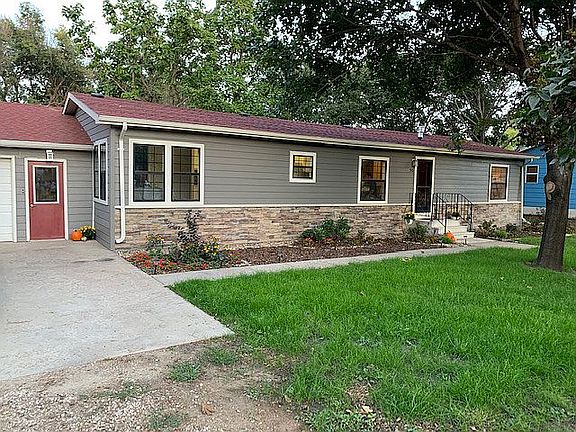 3 bedroom 2 bath Manufactured (on jacks) modular ranch home with some trees and fenced in backyard. Fenced in yard has alley entrance and separate shed painted to match the house. Attached Double car heated garage and room for 6 cars off street parking in the large driveway. Master bedroom with large master bath including double vanity and built-in etched glass dresser. Whirlpool fridge, Whirlpool built-in microwave, and Whirlpool dish washer and used Amana Stove. Gray laminate wood plank flooring throughout the kitchen and into the living room, dining room and hallway. Open floor plan with expansive living room into dining room with etched glass corner built-ins in the dining room. Vanity, sink and toilet, ceramic tile floor and tub/shower combo just off two bedrooms at South end of house. New insulation, hardie board siding front of home and one side, new front steps and hand railing, natural gas McGillvrey Heating and central Air Conditioning unit.