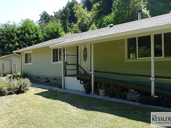 Built by a craftsman for his family in a lovely redwood tree'd backdrop w/ fruit trees, veggie gardens & 9 forested acres. Offers over-sized living room w/ warming wood fired soapstone stove, formal dining room w/ built in cabinetry & a very comfortable windowed bump-out, cushioned & perfect for reading a book or watching woodland creatures in the hills & trees above, kitchen has plenty of cabinet storage & granite counter-tops w/ large, deep stainless double bowl sink, indoor laundry room w/ lots of storage & deep sink to wash up when you come in from the outside thru the side door, bedrooms are all large & have ample closet space, newer dual pane windows., forced air heat. Walk the path along your own private stream. Open House by appointment on Saturday 08/01/20 from 11:00 AM to 2:00 PM