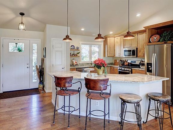Looking for a one-level home that you can bring your suitcase and settle in right away without having to do any renovations? This is your home! From the minute you walk in off the covered, private front porch, you will be greeted by a lovely open concept floor plan with oversized windows to take in the great outdoors. Recent renovations include: alder kitchen cabinets, granite kitchen countertops, solid oak flooring, stacked rock (natural gas) fireplace in main living area, new Milgard windows, new roof, siding with rock accent, and insulated garage door. Additional features include: green space in back of home (adds to the private feel), fenced backyard for your furry kids along with a large over-sized backyard deck, kitchen pantry, crawl space (with vapor barrier), heated garage, and over-sized custom master shower with glass doors.