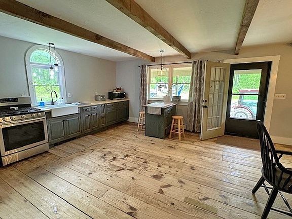 - Features: Beamed Ceilings, Flooring - Wood, Pantry, Kitchen Island, Exterior Access, Open Floorplan, Stainless Steel Appliances