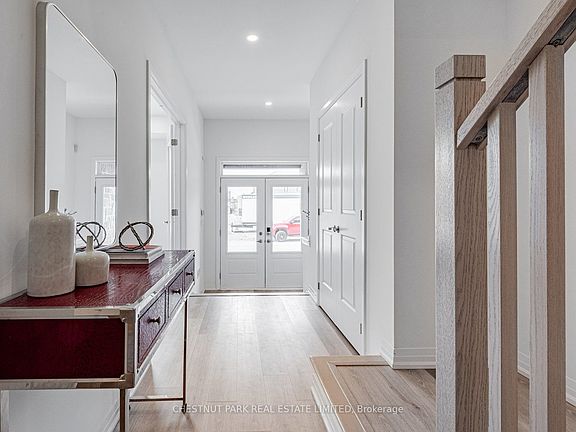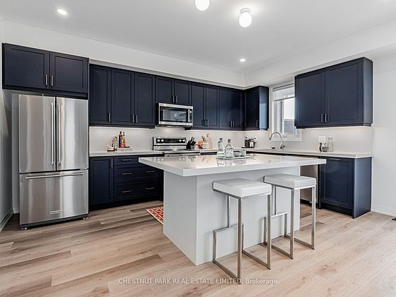Welcome to 50 Robert Eaton Avenue, a beautifully appointed freehold end-unit townhome in a newly built subdivision, featuring a striking stone facade, elegant double-door entry, and the convenience of a private drive with a double garage. A standout home in one of Markham's most family-friendly communities. This bright and spacious 4-bedroom, 4-bathroom home offers exceptional design, quality finishes, and a versatile multi-level layout ideal for modern living. The open-concept main floor is warm and inviting, and oversized windows fill the space with natural light. The contemporary chef's kitchen is stylish and functional. It features granite countertops, stainless steel appliances, a ceramic tile backsplash, and a large center island, perfect for casual meals and entertaining. A unique feature of this home is the ground-level suite, which includes a spacious bedroom, a full bathroom, a separate den/home office area, and direct garage access. This area also has plumbing roughed in for a kitchenette, which is ideal for multi-generational living, guests, or a work-from-home setup. Upstairs, the primary retreat offers comfort and luxury with two walk-in closets and a beautifully appointed 5-piece ensuite, featuring a deep soaker tub, double vanity, and glass-enclosed shower. Two additional bedrooms share a full bathroom, and a main-floor powder room adds convenience. The upper-level laundry room completes the thoughtful design. Enjoy outdoor living on two private decks, perfect for morning coffee or summer barbecues. Located in a quiet, new subdivision steps from parks, top-rated schools, scenic walking trails, public transit, and minutes from shopping and amenities, this freehold townhome offers exceptional lifestyle and value in the heart of Markham. A rare move-in-ready opportunity that blends modern comfort with timeless curb appeal. Don't miss your chance to call this stunning home your own!
