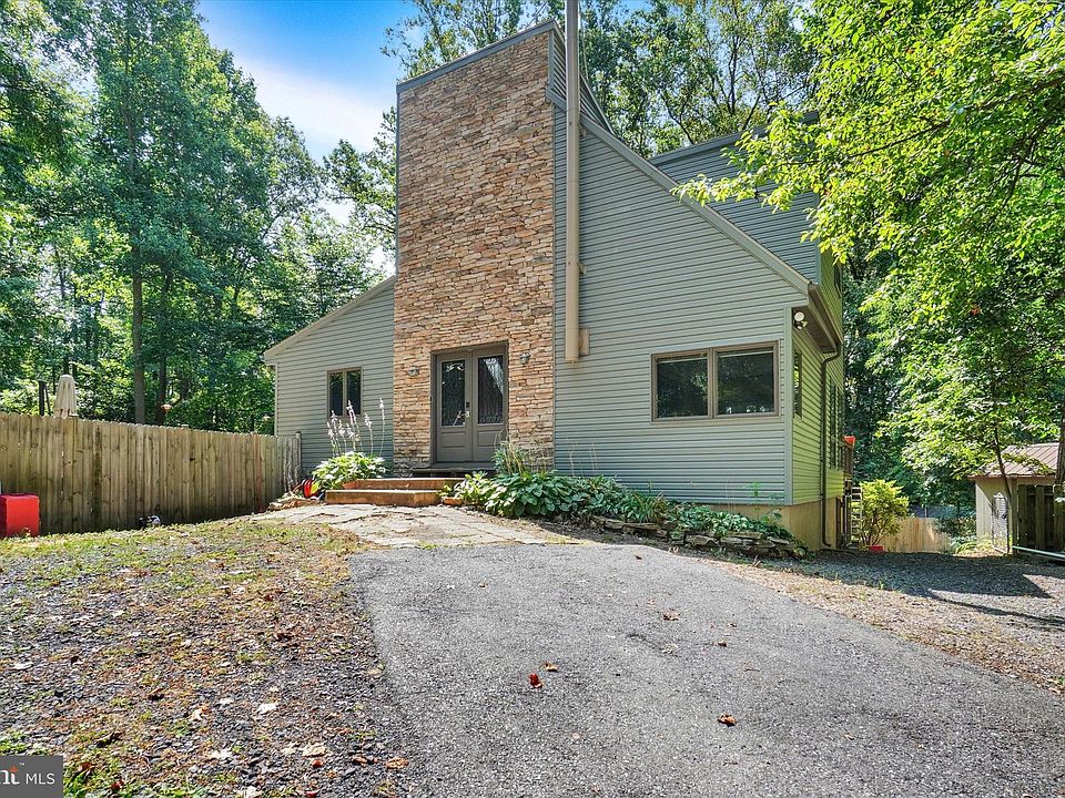 Welcome to this stunning A-frame retreat tucked away in the sought-after Mount Roundtop community! Located in a cul-de-sac, this private wooded oasis sits on over half an acre with beautiful tree-lined views and over 2,170 square feet of finished living space. Step inside to find charming architectural features, exposed beams, bamboo hardwood flooring, and warm beaded pine walls that create a cozy mountain-lodge feel. The dining room offers outdoor access and plenty of natural light, while the brand-new kitchen shines with luxury vinyl plank flooring and a stylish tile backsplash. The spacious family room features vaulted ceilings and large windows, creating the perfect space to relax or entertain. Two main-level bedrooms include vaulted ceilings and laminate flooring, along with a full bath. The newly added sunroom—complete with LVP floors, ceiling fan, and window treatments—is the perfect spot to enjoy the changing seasons. Upstairs, the primary suite boasts bamboo hardwood floors, vaulted ceilings, a large custom closet with built ins, outdoor porch access, and an en-suite bath. The walkout basement adds additional living space with a cozy den and carpeting. Step outside to your backyard sanctuary featuring a deck that overlooks a fenced yard and a gorgeous in-ground saltwater pool—surrounded by nature for total serenity. Recent updates include: HVAC (2024), mini-split in primary suite (2024), well pump tank with on-demand system (2024), newer roof (2018), new deck (2015), wood siding (2014), pool salt system (2021), pool pump (2023), and pool liner (2014). A detached 12x20 garage and ample parking complete this one-of-a-kind property. Don't miss your chance to own this peaceful and private getaway just minutes from amenities. A joy to own!