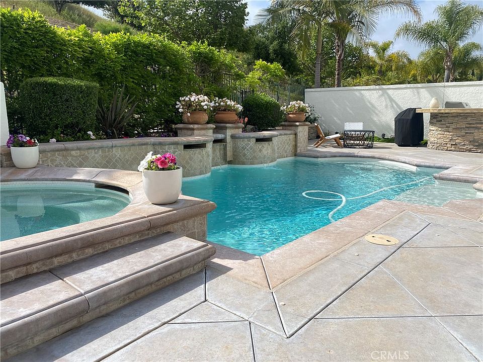 Be the destination home in this Beautifully Upgraded and Tastefully Decorated Pool Home that boasts 4 Bdrms, 3 Baths + Custom Home Office. Meticulously manicured Lush Landscape, new Artificial Turf, Custom Brick Hardscape and Freshly Painted exterior welcome you to this Vista Pointe Estates home. The Double Door Entry opens to new LUXURY Vinyl Flooring, Fresh Paint, an abundance of custom framed windows, Shutters and more. The L/R has a Fireplace, new Lighting + views of the Private Courtyard. The formal D/R has a 2 story ceiling with a Custom Chandelier. The F/R has a Custom Wood built-in with Stacked Stone Fireplace + a French Door that opens to the backyard with expansive views of the Pool and Mountains. The KITCHEN has just been REMODELED with new Quartz Countertops, Subway Backsplash, new Stainless Steel Appliances, Sink and Faucet. There is a Walk-in Pantry and Large Island with seating + a separate Breakfast Nook. There is a Main Floor Bdrm and Full Bath as well as a Home Office with Double French Doors. This home has a dramatic Dual Staircase that leads to the Master bedroom and 2 secondary bedrooms that share a Jack ’N Jill bath. There is Newer carpet, Ceiling Fans, Mirrored Wardrobe Doors, Closet Organizers and an Upstairs Laundry Room. Resort Style backyard boasting a Private Pool & Spa, Fireplace, BBQ, Multiple Patio Areas and Spectacular Mountain View. This home has SOLAR Panels, New Water Heater, New HVAC System and is Truly Turnkey. The community offers a pool, spa, hiking and biking trails and more. This home encompasses Southern California living at it's finest. Centrally located to shopping, schools, freeway and beaches. Honey, STOP the car!