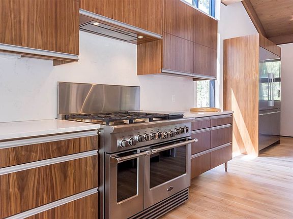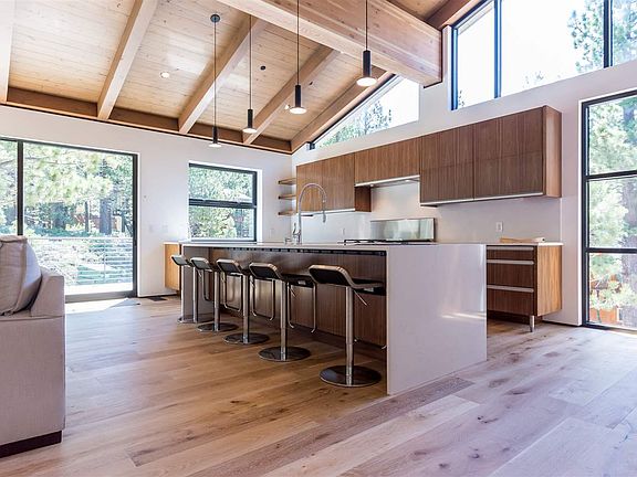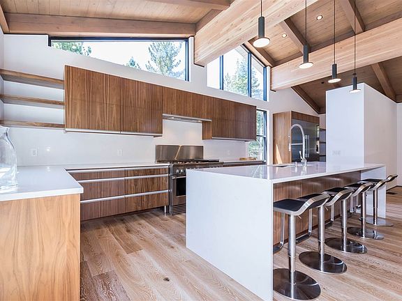 Custom-built modern home on south facing lot in Mammoth Lakes within short distance to The Village and Canyon Lodge Gondola. The modern design sets this home apart with a perfect balance of clean lines and rustic warmth. Located in an easy-access residential area, you can pull into your driveway and go everywhere - no matter what the weather. The upstairs provides an open kitchen with two refrigerators, two freezers, two dishwashers, and an 11’ island with quartz waterfall counter - large parties will feel at right at home. There are four bedrooms with ensuite bathrooms, two of the bedrooms are master suites. All bedrooms feature custom closets with loads of storage. Gorgeous, dual glazed windows throughout the home provide tons of light and the beautiful wood ceilings and wide, White Oak plank floors give the entire house a sense of continuity. A large outdoor deck right off the kitchen / living space is plumbed for a gas BBQ - for more indoor-outdoor living. Other design perks include two flash water heaters, a large laundry room, a second downstairs family room, lots of outside hardscaping for dogs, kids, and gear as well as security cameras that monitor your new home day and night - right from your phone.