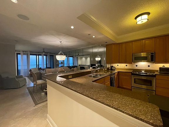The living room has a built-in cabinet with wiring for wall speakers and cable. Nice and spacious kitchen with granite counters a bar countertop. It includes a microwave, electric stove, and freezer/ refrigerator. Bar stools included. There is a beautiful view of the ocean from the kitchen, dining room, the living room with a balcony overlooking the beach.