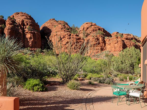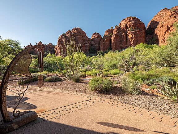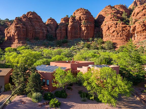 Backing to a spectacular Red Rock canyon this gorgeous home is the quintessence of Sedona -Southwest Style. Highlighting a radius wall w/ floor to ceiling windows that frame the incredible views, this property built in 2000 is situated on a .25 acre parcel which borders the National Forest Service & offers 3388 sq. ft. 3 BR, 3.5 BA, library/study, hobby rm, storage rm & owned solar panels. (APS bill is approx. $9/mo.) The great rm is architecturally stunning & features: spectacular views, elevated ceilings, a gas FP, entertainment center w/ art niches & Viga beams that reflect the radius of the room. The back patio is akin to a nature observatory - an ideal setting to witness to the incredible abundance of fauna that live amid the magnificent desert landscape. See supplement!