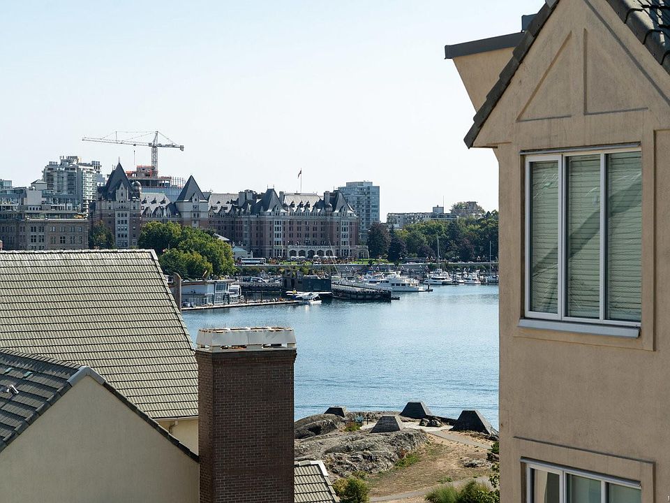 Morning sunrises over the city w/south eastern views of the Empress Hotel & Inner Harbour, along w/just under 1,500sqft of living space, makes this a standout top floor condo. Ideally located in one of the city’s most desirable neighbourhoods, offering tranquility w/immediate access to downtown. Inside, an open-concept layout features high ceilings, expansive windows & abundant natural light. The living room, anchored by a cozy gas fireplace, is framed by harbour views, while the adjacent dining area easily accommodates gatherings against the Empress Hotel & Inner Harbour backdrop. The private primary suite boasts generous proportions, large windows & spacious ensuite. A second bedroom enjoys harbour views to the south west, w/a full bath nearby. Additional highlights include a laundry room, ample in-suite storage, secure parking & building amenities such as a lounge, conference room, guest suite & landscaped courtyards, plus the waterfront pathway linking to the marina, shops & cafés.