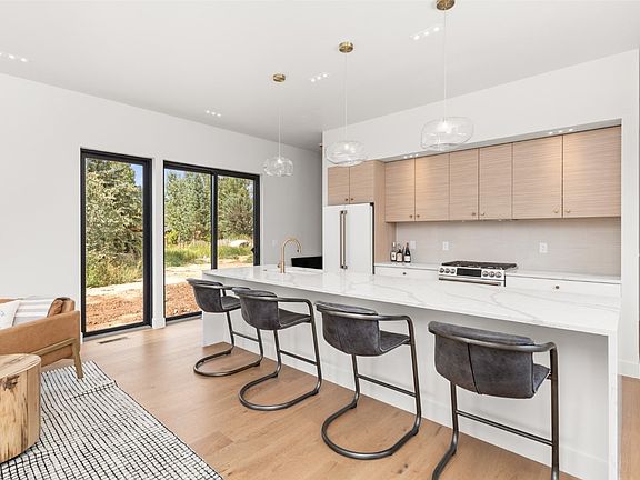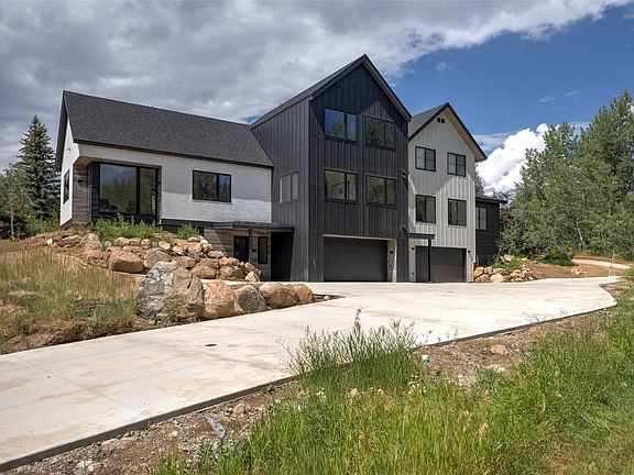 Newer construction in desirable Mountain View Estates in Steamboat Springs. Situated between town and the mountain, you will love this neutral and contemporary palette with abundant natural light. The home boasts 4 bedrooms, 3.5 baths, 2-car garage with extra storage space. There are two ensuite bedrooms/bathrooms and the vaulted ceilings upstairs give the rooms added space and are enhanced by a wealth of windows. The kitchen is equipped with two-toned cabinetry by "Primary Kitchen", GE Cafe white appliances with brushed bronze fixtures that offers an artistic flare to the overall design. The expansive kitchen island is a centerpiece, showcasing beautiful quartz with white and earthy tones, complete with a cascading waterfall edge on both sides, and adorned with playful bubble glass pendants. Also on the main floor is a pantry, appliance garage, laundry and powder room and two rooms that can be used as offices, playroom, dining room, you name it. The living area opens up into the backyard patio area for added entertainment space in the summer months. The primary suite is on the main level boasting a spacious shower, twin vanities, separate toilet closet and large walk-in closet. Two bedrooms upstairs share a full bath while the additional bedroom has it's own 3/4 bath. The open entry invites you in with an efficient closed off mudroom that is adjacent to the over-sized 2-car heated garage. There is an additional 2-space parking pad for guests and the exterior brings in modern, rustic and durable finishes. Gas forced heating, air-conditioning and efficient on-demand hot water round up the home systems. The home was landscaped this fall, featuring a large back patio, hot tub area, trees for privacy, paths, rockwork for drainage, and a nice area of irrigated grass. You won't find many newer construction properties in this area, so seize the opportunity to make it yours!