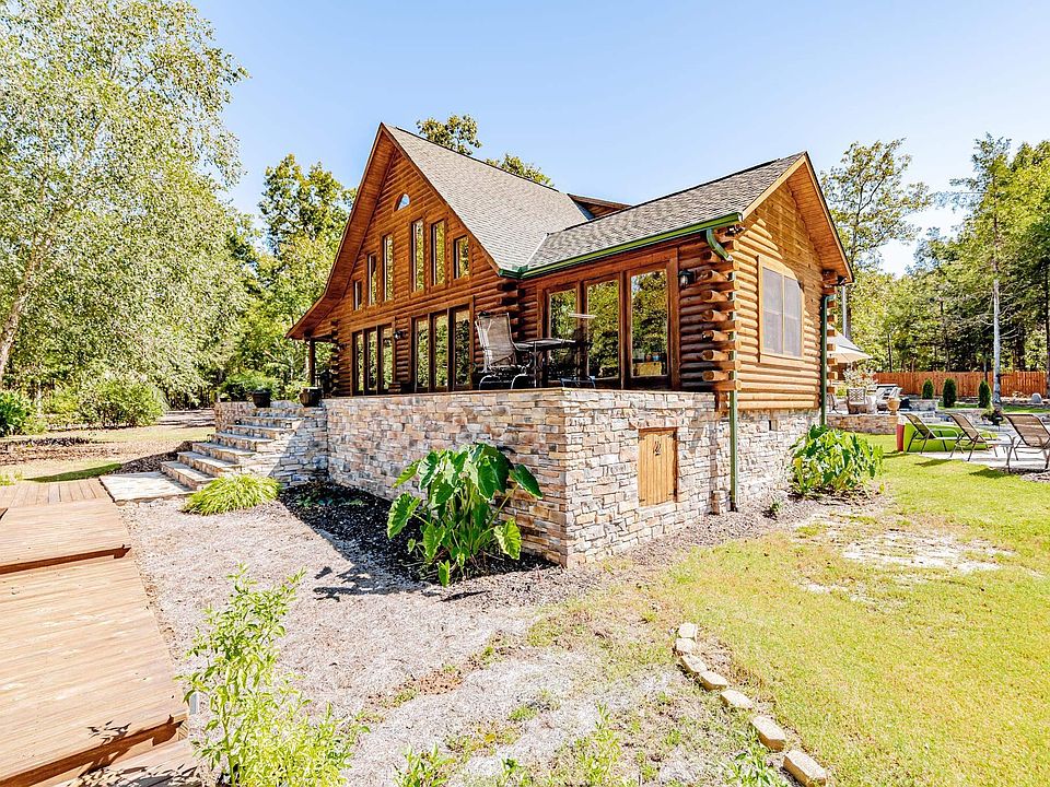 Custom log homeStainless steel appliancesGranite and tile bathroomsHardwood floorsCustom stone patioStone retaining wallGranite countertops