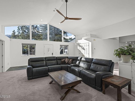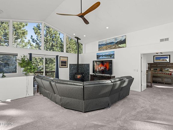 Nestled in a prime, peaceful setting just minutes from Reno, Lake Tahoe, and Mt. Rose Ski Resort, this breathtaking mountain retreat blends privacy, comfort, and resort-style living on .68 lush acres with local mountain and tree-lined views. The main-level primary suite offers ease and elegance, while a second ensuite bedroom creates a true private sanctuary—complete with a custom steam shower, personal sauna, wine cellar, and its own private outdoor access. The gourmet kitchen anchors the home with a large center island, sizeable walk-in pantry, and wine refrigerator, allowing you to enjoy the views while in the kitchen, whether cooking or entertaining. Soaring ceilings and picturesque windows at the main entry frame stunning natural scenery and lead into a warm, inviting living space highlighted by a cozy pellet stove. An additional bonus/flex room adds valuable versatility—ideal for a home office, media room, gym, or guest space—giving you the flexibility to tailor the home to your lifestyle now and into the future. Oversized two car garage provides plenty of storage and room for parking. Outdoor living shines with an expansive deck and an elegant custom-covered hot tub, accented by rustic wood beams for a refined, resort-like atmosphere. Serene, private, and beautifully positioned near world-class ski resorts with easy access to Lake Tahoe and Reno—this is mountain living at its finest.