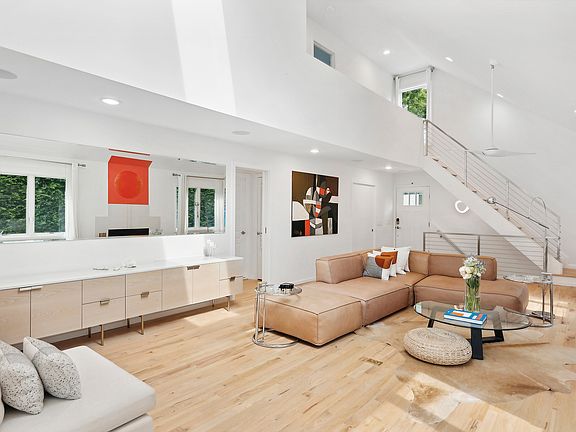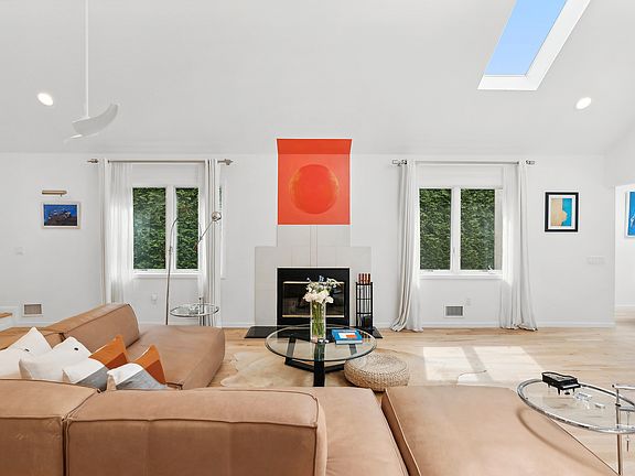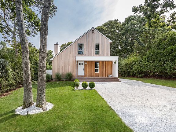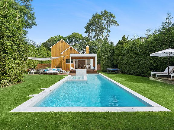 Sublime and minimal on the exterior, yet brimming with soulful and spirited energy within, this treasure of a home is perfectly poised across the street from Sag Harbor Bay. Enjoy water views and community private beach access, with a charming front porch ready for your morning coffee or evening rose. With a relaxed beachy vibe throughout, this home seamlessly caters to indoor/outdoor living in the Hamptons. The airy living room, featuring a fireplace, flows effortlessly into an open kitchen and skylit dining space. A wall of glass with double sliders leads directly to the pool and yard, enhancing the sense of space and light. The den boasts a built-in bookcase and a desk nook, ideal for a home office. A first-floor guest room and full bath complete this level. Upstairs, find two serene bedrooms, one offering fantastic views, and a modern bath with a skylight, flooding the space with natural light. The back garden is an oasis of refined luxury. At its center, a sculptural Afyon Ice White Marble waterfall accents the heated saltwater pool, surrounded by the same stunning white marble and a wraparound Brazilian teak patio. Entertainers will delight in the manicured yard, bordered by evergreens and fenced for privacy. Patio areas are thoughtfully designated for lounging in the saltwater jacuzzi that accommodates 10, entertaining with an outdoor fire pit and ping pong, grilling, and alfresco dining. The home's exterior is newly clad in soothing clear cedar, punctuated with an open-air outdoor shower and white stucco overhead at both the front and rear landings. Nestled in a private Sag Harbor Village beach community, watersports such as kayaking and paddleboarding are right down the street, offering endless opportunities for outdoor enjoyment. Embrace the ultimate Hamptons lifestyle in this true beach house, where comfort and elegance meet. This home delivers a perfect blend of relaxed sophistication and luxurious amenities, ready to create lasting summer memories.