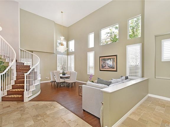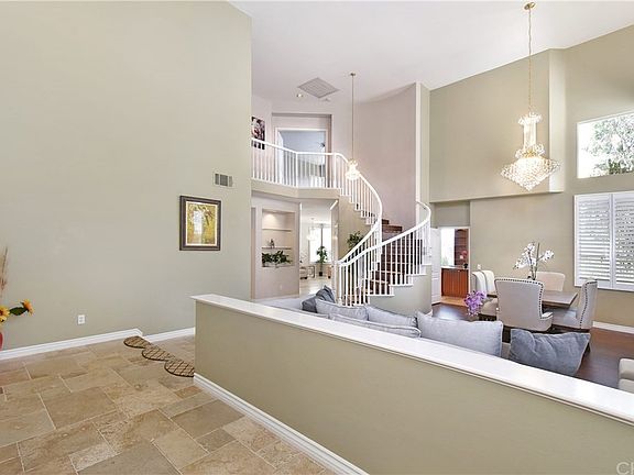 Rare city lights view home in famous Foothill Ranch! The most desirable orientation, south at the back yard. If you are looking for a dream kitchen, look no further. This gorgeous home boasts Viking appliances, custom maple cabinetry, granite-topped island, chiseled travertine flooring downstairs, laminate wood flooring upper level, and plantation shutters all over the house. A Viking Professional six-burner stove with double convection oven, Viking thermal pro chill built-in refrigerator, dishwasher, and stove top food warmer make this a real Chef's kitchen. Unique floor plan offers 5 bedrooms/3 baths, the most desirable Lyon Heights model. Newer chandeliers installed in the formal living room, next to the spiral staircase, and the family room. The cozy downstairs bedroom is perfect for guests and offers an upgraded full bath with granite counters. Pass through the formal living room with soaring two-story high ceilings and up the spiral staircase to an over-sized Master en suite with stunning Catalina Views and two large walk-in closets. Each bedroom has ceiling fan. The whole house power ceiling vent cools the indoor in minutes. New A/C pipelines just installed. Designer's paints throughout the house. Solar panels installed on the roof. Water softener and purify system installed for a healthier lifestyle. The nearby Town Center has multiple restaurants and shopping locations convenient for your daily needs. Hurry, this unique home won't last.