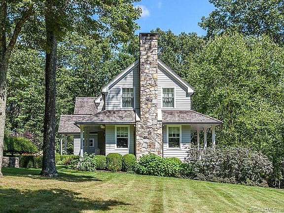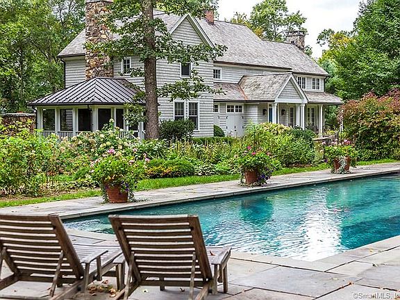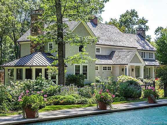 Private Modern Shingle-style country property. Five bedroom, four and a half bath home. Eat-in country kitchen with fireplace. Living room with fireplace. Dining room. Covered porch. Family room with built-in bookshelves and fireplace. Screened porch with fireplace. Luxurious master suite with full bath and his/her closets. Sauna. Wine cellar. Elevator. Surround sound. Generator. Two-car attached garage. Flagstone terrace with pergola and outdoor fieldstone fireplace. Heated gunite swimming pool with flagstone terrace and Jacuzzi. Perennial gardens. 5± Acres.