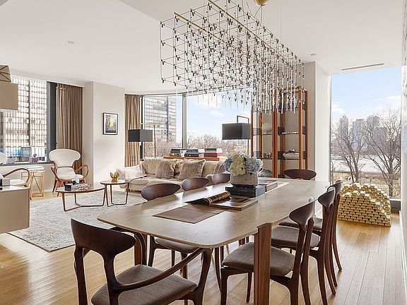 A formal entry gallery leads into an expansive living and dining area with floor-to-ceiling windows framing open city and East River views, delivering brilliant natural light throughout the day. The sleek, modern kitchen features top-of-the-line appliances, custom cabinetry, and elegant finishes ideal for both everyday living and entertaining.