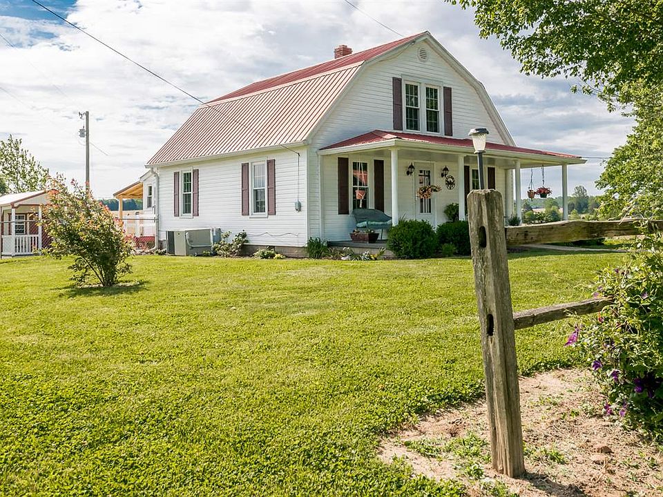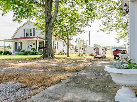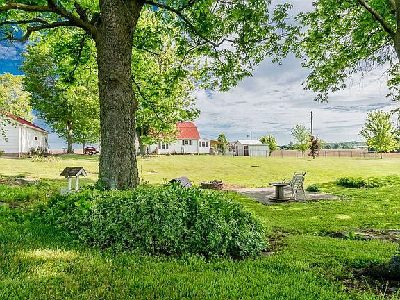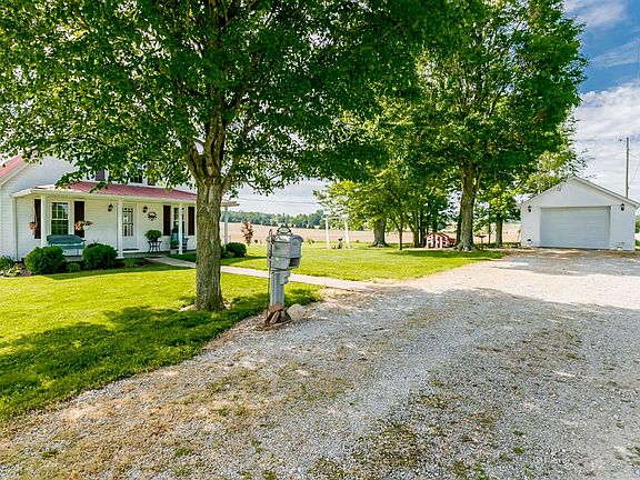 The perfect combination. Renovated farm house charm and beautiful countryside. Recently added, covered rear patio (30'x9.5') invites you to enjoy sunrise over expansive farmland views. 1-acre yard is perfect for garden with approx. 95'x95' fenced area. Covered Front porch (24'x8') enjoys shade from mature trees. Outbuildings include newer she-shed/man-cave/workshop (11'x18') with electric, original garden shed (17'x12') and detached one-car garage (28'x16') with storage and 10' garage door/electric opener. Home features a metal roof, vinyl siding, newer windows, and updated mechanicals including plumbing and water heater. Enjoy the electric fireplace in the Living Room and propane fireplace in the Dining Room. Eat-in kitchen with a view of yard over the large sink, modern backsplash and updated counter and cabinets. Laundry room located off the kitchen with new utility sink and access to rear patio. Master Bedroom with sitting/office nook and private exit to patio. Convenient access to full bath. 2nd floor bedroom (15'x16') has adjacent sitting area (9.5'x10.75'), and full bath. Home additionally offers ceiling fans throughout, fresh interior paint, and attic storage.