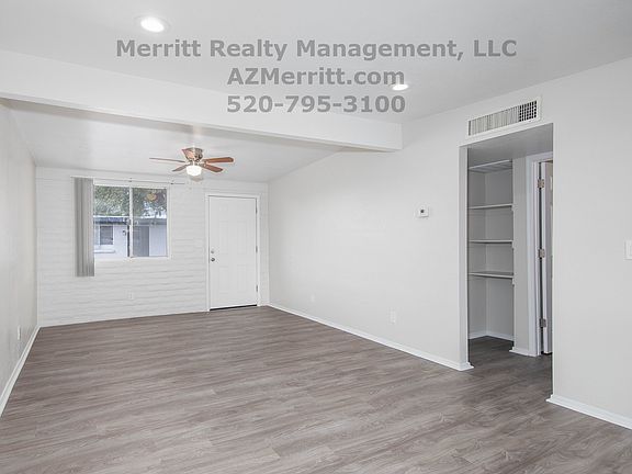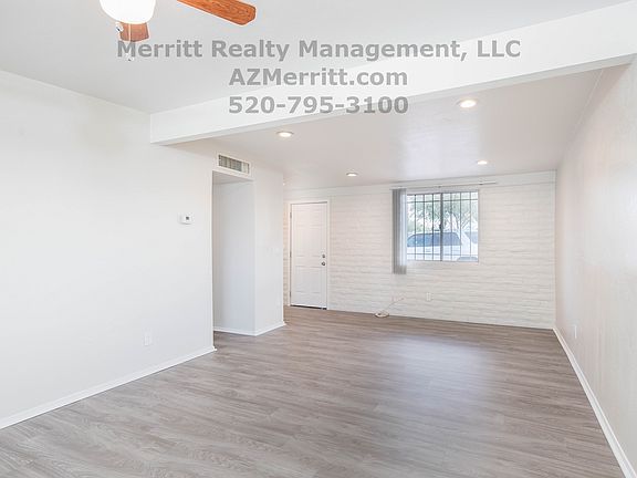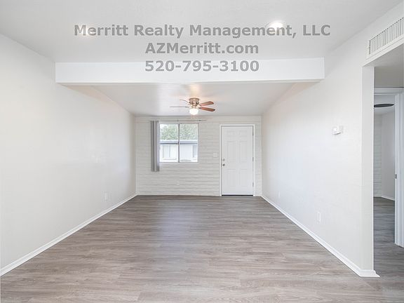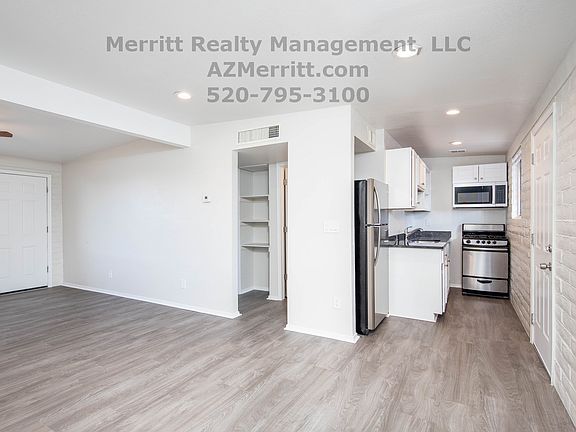 Experience modern living in this beautifully renovated home featuring luxurious granite countertops and stainless-steel gas stove and refrigerator. This even has an over-the-range microwave. The bright and airy interiors are complemented by a subway-tiled bathroom, LED recessed lighting, ceiling fans, and sleek, vinyl planking flooring. Freshly painted with custom colors, blinds, a dedicated dining area, and secure entry doors for added peace of mind. This unit is climate-controlled with central air conditioning and gas heating, ensuring your comfort year-round. This one-story home is located in a gated community that offers off-street parking, a 24-hour laundry room, and a spacious courtyard with BBQ grills perfect for gatherings. An additional storage room is available at no additional cost. The location is unbeatable, just moments away from Tucson Mall, Downtown Tucson, and popular shopping and dining destinations. The University of Arizona and I-10 are also nearby, making this home convenient for commuting or exploring the city. 1st month free with a 12 month lease! This is the home you've been waiting for contact us today to schedule a tour! This community is pet-friendly, welcoming cats and small dogs with a refundable $150 deposit and $25 monthly pet rent per pet. Restrictions apply on the number and breeds of pets allowed. The home is non-smoking, and tenants are responsible for their own electricity, gas, and a portion of the water, sewer, and trash costs. The application fee is $40 per adult, and no hidden fees or additional administrative charges are required to move in. The rent quoted is based on a 12-month lease.