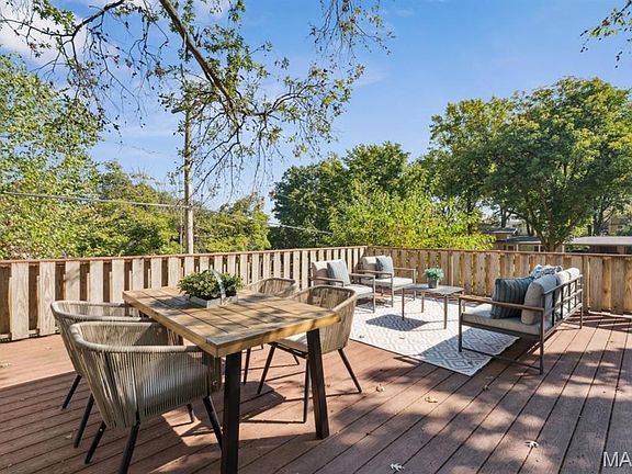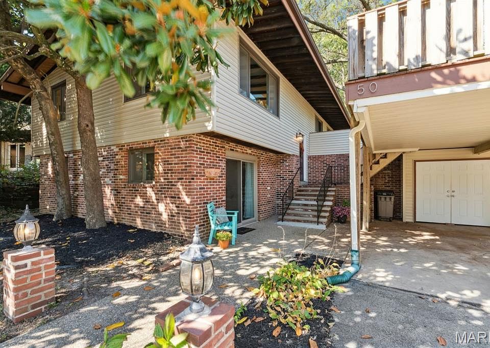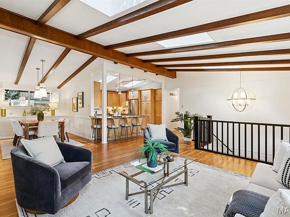 Welcome to 50 Willow Brook Drive, a beautifully updated split-level home that blends mid-century modern design with thoughtful renovations. Vaulted & beamed ceilings soar over the open living & dining areas, while skylights bathe the space in natural light & emphasize the home’s architectural character. The remodeled kitchen features abundant cabinetry, Cambria quartz counters, modern appliances, & more skylights creating a bright inviting hub for everyday living & entertaining. The main level offers 3 bedrooms, including a primary suite w/attached bath, custom closet, & direct access to private deck. Remodeled hall bath nods to mid-century style with clean lines, bright finishes, & brand new vanity (2025). Two additional bedrooms complete level. The lower level provides spacious rec room, perfect for movie nights & casual gatherings, & low-maintenance luxury vinyl plank flooring. Updated powder room w/stylish statement wall + laundry & storage. Outdoor living shines here, with HUGE ROOFTOP COMPOSITE DECK (2014) that feels like a grown-up treehouse. Plenty of room for lounge furniture & outdoor dining set to maximize the al fresco experience. Yard backs to trees for private & serene setting. 2-car covered carport w/storage areas. Pattonville School District & walkable to Willow Brook Elementary. Close to grocery store, dining, movie theater, JCC & more. Renewal by Anderson windows & sliding glass door (2016 & 2019), roof (2016), skylights (2018). This is a gem!
