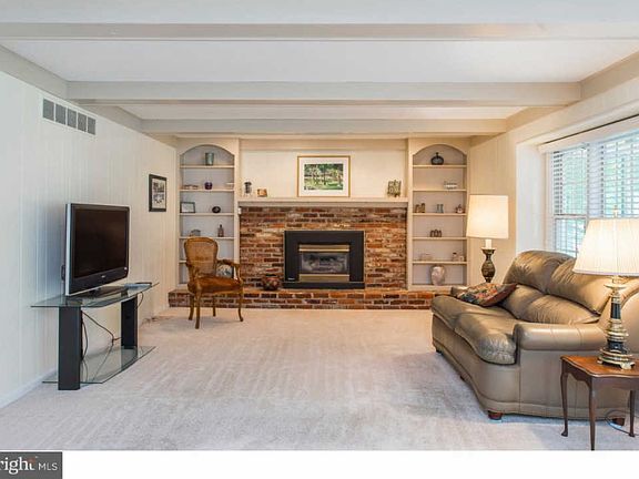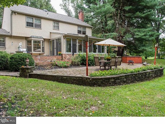 ***Septic inspected and passed. Report available upon request.***This stately center hall colonial sits on 2.27 acres with a beautiful private pond. The brick walkway meanders past lovely plantings and a lush grassy yard. Once inside you will notice wood flooring in the entry, stairs and kitchen. The large living room has crown molding and is currently serving as an office. Entertain in the cheerful dining room or have casual meals in the sunny eat in the kitchen, complete with a bay window, lots of white cabinetry, Corian counters and all the right appliances. The large family room has a propane fireplace flanked by built in shelving. Enjoy views of the pond and fountain from the sun room with windows all around and a gas stove to keep you cozy and warm. A half bath and large laundry room with a sink and private entrance round out this floor. Upstairs you will find a good sized master suite with his and hers closets. The updated master bathroom has a tile floor with radiant heat, rain glass shower door and 2 newer vanities. Three other bedrooms have good closet space and ceiling fans. The hall bath boasts a Jacuzzi tub and 2 sinks. The views of the pond are just lovely from the 2nd floor. The basement has a large game room, a wet bar, an office and a large storage room. Relax out back on the inviting tile patio or have some fun in the large rear yard. All this and close to Doylestown boro, 263 and 202, Make this lovely home your own! (water softener, bar ice maker,fridge and hot tub are AS IS)