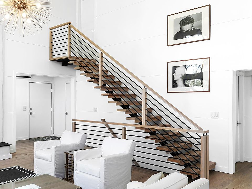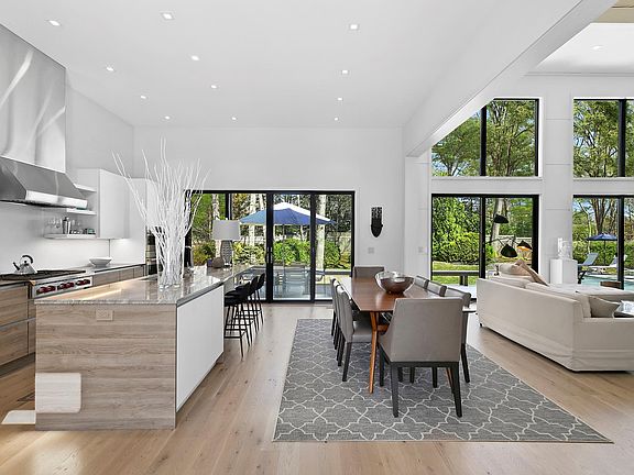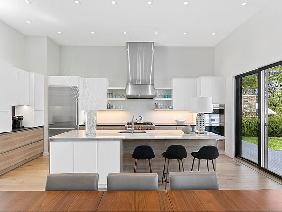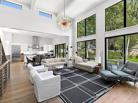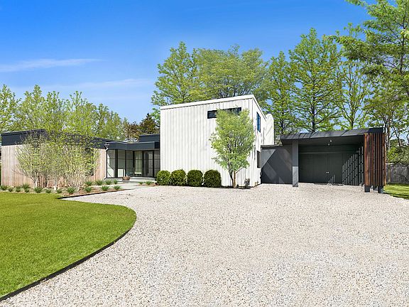From the graciously spacious entryway you will enjoy expansive double height and clerestory windows that flood the first floor with natural light and beckon the outdoors in. The first floor includes a gourmet kitchen adjacent to the dining area and cathedral ceiling great room with fireplace, office/study with a wet bar, powder room, en-suite main bedroom with walk-in closet, and two en-suite guest bedrooms. Ascend the spectacular architectural floating staircase to a second en-suite main bedroom also with walk-in closet. Descend these same stairs to a lower level with an en-suite bedroom and a media/rec room. Both have expansive 4'x12' window wells ensuring natural light. An impressive 2,000 bottle wine cellar/tasting room and laundry room complete the lower level. This home is 4,111 sf including a 1,234 sf lower-level with proper egress and including one bedroom, one bathroom, media/recreation room, wine cellar and laundry room. Outside is a large deck for grilling, dining and entertaining, mature trees for privacy and professional plantings for year-round color, lawn for frolicking, heated pool, outdoor shower, and a covered carport. All of this in close proximity to the world's finest ocean and bay beaches and everything the Village of East Hampton has to offer.