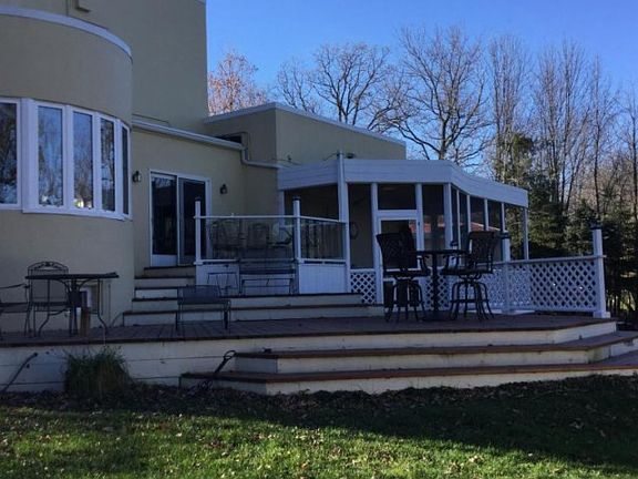 What a great location for the nature lover! Unique & lovely home on 2.59 acres minutes from town on blacktop. Home has great windows that overlook multi-layer deck, 3 season porch, gazebo and gorgeous yard along Turtle Creek. Kitchen has cherry cabinets w/island open to DR w/wet bar, sunken LR, open staircase to 3 BR's including master bedroom w/master bath, LL FR, workshop, BR and bath.