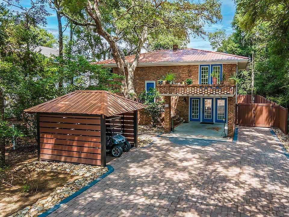 Always dreamed of owning your home close to the ocean...well find it in this beauty of a 4BR/3BR 2-story all brick cottage with outside and inside appeal that will please the most discerning buyer. Location is phenomenal, steps to the ocean, walk or golf cart to the park, restaurants, dancing , shopping. Drive up to this true cottage with all brick exterior and yard gorgeously landscaped with character throughout. Every detail is in place to the cutest golf cart shelter with matching metal roof to accent lovely metal roof on home and back yard storage building. Yard has mature trees and landscaping with accents like quaint paver driveway, paver winding walks to lovely swing area, outside shower area, and to the gated entrances on either side of home leading to a fully landscaped private fenced in backyard that will really impress you and provide a gorgeous outside living area for you and your guests. Now venture into the home either through a front door on second level or enter thru a French door on bottom level. On the bottom level go into a large family room and bonus area with wet sink that are totally open to each other & perfect for great gatherings and did I mention you can access the back yard from this area into a total paradise. The Back yard is a private haven with winding paver walks, lovely landscaping, trees, and yes there's a storage building in back with a matching metal roof for all your beach toys. On the first level, find a large utility room complete with washer and dryer. Most floors on this level are wood tile for ease and beauty, and the beach cottage feel. There are 2 bedrooms on this level, one which could be a second master and another good size bedroom. A gorgeous renovated bath is close to these 2 bedrooms and has a lovely large tiled shower and upscale sink area. Ready for the second level featuring hardwood floors in the large family room/den and fully open to a recently renovated kitchen with hard surface counter tops, coordinating back splash, stainless steel appliances (smooth top, side by side fridge, dishwasher, breakfast bar). There's also a door that leads from the family room to the large balcony overlooking ocean side of home where you can sun, visit, feel the ocean breezes and know that you have arrived at your peaceful place. A second larger master is located on this level as well as another great size bedroom both boasting hardwood floors and yes there is an outstanding master bath complete with 5 ' seated shower and vanity. Right off the family room / kitchen area is another full tiled bath with another walk-in shower perfect for your and your guests convenience.. See this home full of character , the gorgeous yard, low maintenance, and all this just steps away from the ocean. You'll want to call it yours.