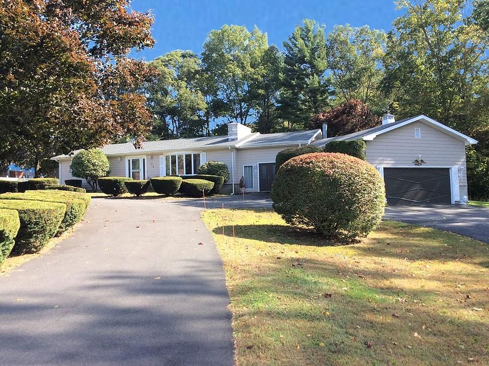 WATERVIEWS & SUNSETS over the Watuppa Pond! SINGLE LEVEL LIVING RANCH with a separate lower level potential in-law set up. Over-sized Custom Contemporary Ranch in a Private Country Setting. This home enjoys an open floor plan, wood beam cathedral ceilings, 3 living areas, 3 marble or brick fireplaces, 3 bedrooms, a potential home office with a separate entrance, 2 kitchens, 2 full baths (1 has a tub and separate shower), dining room with 2 glass sliders leading to the large cement deck, 3 car garage and recently paved off street parking for 6+ additional cars. Professionally landscaped large secluded yard with stone walls and mature trees and a storage shed. Lots of space to play ball, have a cook-out or just relax and enjoy the day. A peaceful oasis conveniently located with easy access to highways and shopping. Make an appointment now!