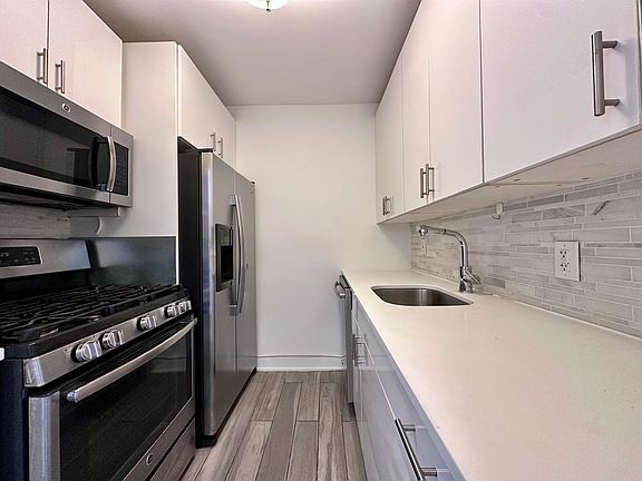 Enjoy a spacious and freshly painted one-bedroom unit on the 5th floor of the full-service Lenox Condominiums, featuring partial NYC views and a popular layout. The kitchen has been upgraded with white cabinetry, modern backsplash, granite countertops, and stainless steel appliances, while hardwood floors run throughout the unit.