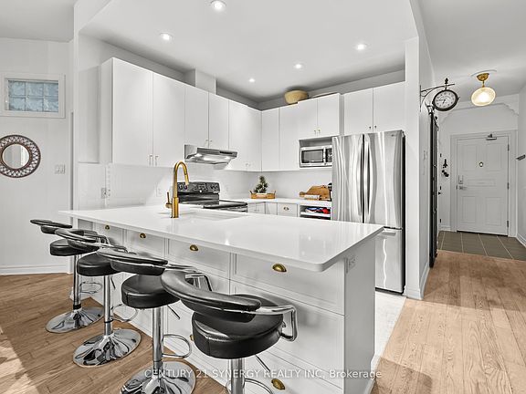 WELCOME HOME! This stunning contemporary flat features modern finishes and design, in the heart of one of Ottawa's premiere neighbourhoods. Steps from Barrhaven Marketplace, you'll enjoy all of the conveniences and amenities offered in Longfields, as well as being moments from fantastic schools, parks, restaurants and public transit, offering easy access to the rest of the city. Featuring 10' ceilings, an open concept and floor to ceiling south-west facing windows, you'll fall in love with the natural sunlight flooding your space! The cozy electric fireplace, and airy design make this an elite space for entertaining year round. Make yourself at home in the fully updated kitchen offering premium stainless steel appliances, quartz countertops, oversized bottom mounted sink and ample cupboard space, perfect for the weeknight cook or professional chef's alike. The spacious primary bedroom offers ample space for a king sized bed, floor to ceiling windows, as well as a large closet with convenient built ins.The unit is complete with in-suite laundry, also offering ample storage. The unit is located in a secured building, also offering a newly complete storage area for your convenience. This condo features a fantastic contemporary space offering a perfect blend of modern style, convenience and comfort. Book your viewing today!