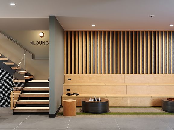 The internal staircase ties together three levels of amenities creating a vertical, connected community. Start in the welcoming lobby lounge, step outside to a landscaped patio with seating, games, and dog run. The Longo Room, a curated gathering space, celebrates the site's civic past.