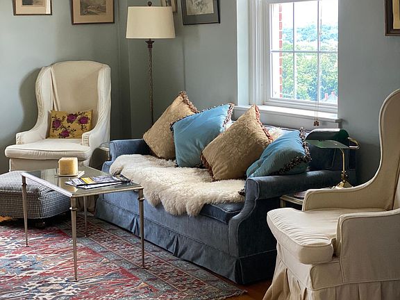 Light filled, elegantly fully furnished penthouse apartment on 10th floor of historic 1926 former hotel, with beautiful views over the city of Charlottesville. Quiet, private floor with shared laundry. Apartment comprises 1 bed, bath, living-dining space, and NYC style efficiency kitchen. Staffed, historic building, central to everything. Walk/bike anywhere. 6 month minimum but extended lease considered. 1 month trial. All utilities included plus parking at Market St Parking Garage.