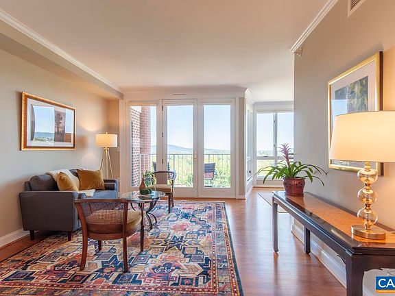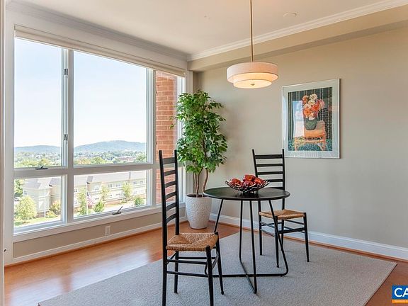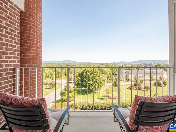 Be in AWE of the STUNNING panoramic views from this spacious and beautiful 4th floor condo in amenity rich University Village! Every room and the private balcony offer East facing views to see the sunrise, Piney Mountain, Monticello, Carter Mountain and landscaped grounds and tree canopies below. Easy living and flow in this 2-bedroom, 2-full bath unit with welcoming foyer, lovely living room, separate study with built-ins, dining room, laundry room, generous walk-in custom closets and tons of storage. The unit has been freshly painted and lighting updated to complement the gleaming hardwood floors throughout. Community amenities are: heated indoor pool, gym, OPTIONAL fine dining, library, robust social calendar, beautiful surroundings/walking paths and gorgeous hilltop setting, 24 hour front desk attendant, ample guest parking. Condo fee covers: electricity, heating, cooling, water, sewer, gas, trash, basic cable, community amenities, reserve funds, and more. One designated covered parking spot in garage and one parking lot space available. Locked unfinished storage room in front of garage parking space. Ideally located minutes from UVA, Foods of All Nations, trails, restaurants, sport complexes and more.