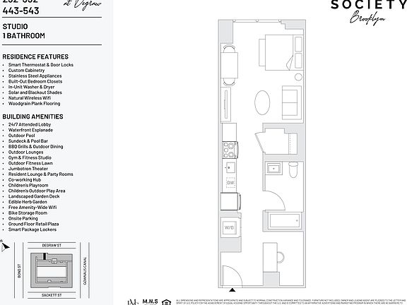 Amazing Studio Available Now! GRAND OPENING 5/15! Book Your Tour Now! Now Offering 1.2 Months Complimentary on a 13.2 Month Term Welcome to Society Brooklyn! Modern Elegance with Iconic Views on Brooklyn's newest Waterfront Esplanade! Discover a new level of luxury at Society Brooklyn, where urban sophistication meets modern comfort along Brooklyn's newest waterfront esplanade. Nestled at the intersection of Carroll Gardens and Park Slope, our residences offer an unparalleled lifestyle designed for those who crave both style and substance. Our thoughtfully crafted residences blend sleek, modern finishes with warm, livable design, perfecting the balance between elevated aesthetics and everyday functionality. Expansive windows flood each home with natural light, while select units offer breathtaking skyline and canal views that bring the beauty of Brooklyn right into your living room. Residences feature: Spacious open concept layouts Custom black oak kitchen with premium stainless-steel appliances LG in-unit washer/dryer Oversized windows and wide-plank flooring Spacious Bathrooms with LED mirror light Window roller shades: white 5% light filtering with blackout in bedrooms Amazing Views Signature Amenities Fitness & Wellness: Stay active in our expansive modern fitness center, including: Cardio studio Yoga & meditation studio Training floor with a wide range of new Technogym strength and cardio equipment Ditch the private gym membership. We've got you covered for any workout need. Co-Working Hub: Multiple private offices available 24/7 for residents Designed to facilitate a comfortable and convenient work-from-home without the need to be in your home Unwind or connect in multiple resident lounges, designed for both social gatherings and quiet relaxation. Our sprawling outdoor amenity deck is your warm-weather escape: Resort-style pool with sundeck Pool bar & fire pits BBQ grills with al fresco dining setups Outdoor yoga, fitness, and lounge zones Experience modern elegance with iconic views Rooftop terrace offering panoramic, 180-degree city views Many units boast stunning skyline views Daily Convenience Attended parking garage Secure bike storage Package room & concierge services 24/7 Lobby Concierge Waterfront Park & Esplanade Access to an expansive waterfront park and esplanade with landscaped walking paths, seating areas, and stunning views A vibrant gathering place with dining options, shops, and embracing the arts community Equal Housing Opportunity. Photos, Videos, and/or 3D tours may reflect a similar unit rather than the specific listing.
