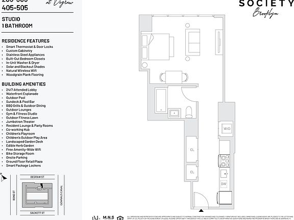Amazing Studio Available Now! Now Offering 2 Months Complimentary on a 17 Month Term Welcome to Society Brooklyn! Modern Elegance with Iconic Views on Brooklyn's newest Waterfront Esplanade! Discover a new level of luxury at Society Brooklyn, where urban sophistication meets modern comfort along Brooklyn's newest waterfront esplanade. Nestled at the intersection of Carroll Gardens and Park Slope, our residences offer an unparalleled lifestyle designed for those who crave both style and substance. Our thoughtfully crafted residences blend sleek, modern finishes with warm, livable design, perfecting the balance between elevated aesthetics and everyday functionality. Expansive windows flood each home with natural light, while select units offer breathtaking skyline and canal views that bring the beauty of Brooklyn right into your living room. Residences feature: Spacious open concept layouts Custom black oak kitchen with premium stainless-steel appliances LG in-unit washer/dryer Oversized windows and wide-plank flooring Spacious Bathrooms with LED mirror light Window roller shades: white 5% light filtering with blackout in bedrooms Amazing Views Signature Amenities Fitness & Wellness: Stay active in our expansive modern fitness center, including: Cardio studio Yoga & meditation studio Training floor with a wide range of new Technogym strength and cardio equipment Ditch the private gym membership. We've got you covered for any workout need. Co-Working Hub: Multiple private offices available 24/7 for residents Designed to facilitate a comfortable and convenient work-from-home without the need to be in your home Unwind or connect in multiple resident lounges, designed for both social gatherings and quiet relaxation. Our sprawling outdoor amenity deck is your warm-weather escape: Resort-style pool with sundeck Pool bar & fire pits BBQ grills with al fresco dining setups Outdoor yoga, fitness, and lounge zones Experience modern elegance with iconic views Rooftop terrace offering panoramic, 180-degree city views Many units boast stunning skyline views Daily Convenience Attended parking garage Secure bike storage Package room & concierge services 24/7 Lobby Concierge Waterfront Park & Esplanade Access to an expansive waterfront park and esplanade with landscaped walking paths, seating areas, and stunning views A vibrant gathering place with dining options, shops, and embracing the arts community Equal Housing Opportunity. Photos, Videos, and/or 3D tours may reflect a similar unit rather than the specific listing. *Price shown is Base Rent. Residents are required to pay: At Application: Application Fee ($20.00/leaseholder, nonrefundable); At Move-in: Refundable Security Deposit:$1,000 for qualified applicants and up to one months rent/unit); Monthly: Community Amenity Fee ($95.00/leaseholder- optional); Electric-3rd Party (usage-based). Please visit the property website for a full list of all optional and situational fees. Floor plans are artist's rendering. All dimensions are approximate. Actual product and specifications may vary in dimension or detail. Not all features are available in every rental home. Please see a representative for details.