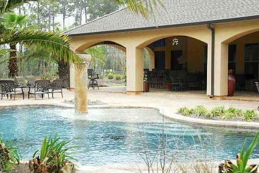 Mediterranean Style Villa. Open floor plan w Venetian style plaster, arches, limestone, and heart pine beams. Kitchen w 6 burner cooktop and built-in fridge. 4 lg. bedrooms/3 baths/2 half baths. Outdoor area w 1000+ SF covered, ceiling fans, outdoor kitchen/bar, TVs overlooking saltwater pool, fire pit and tropical landscaping. Attached 4 car garage + workshop w RV parking. 2 yrs old, 3 ac in A+ school dist. w easy access to I-12 and Causeway.