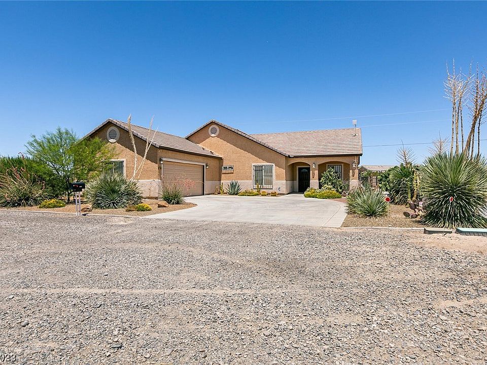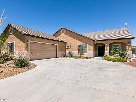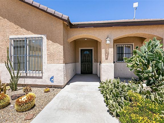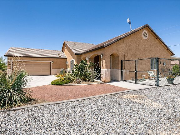 Peacefully resting in Pahrump Nv sits this single story home that with well manicured landscaping that can easily be maintained with a 2 car garage and side RV parking! It offers 3 bedrooms and 2 bathrooms with an open floor plan that has vaulted ceilings that makes it feel much larger then it is! The generous size great room is fully tiled with built in pop out shelving and is adjacent to the dining area. The kitchen displays a pull up breakfast bar that sits 4 with granite counter tops and plenty of cabinets and open shelves. The master bedroom continues with a vaulted ceiling and tile with a private door leading to the back yard. The back yard has a covered patio to enjoy your evenings with a concrete patio for extra parking through the gate. This home is made for entertaining without the full maintenance of taking care of a large lot!