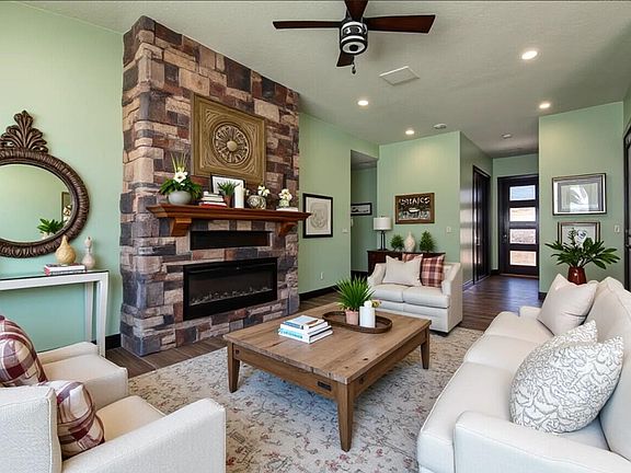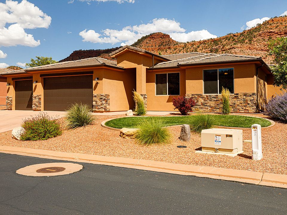 Live surrounded by breathtaking red rock canyon in this beautifully designed 3-bedroom, 2-bath home located in a vibrant and amenity-rich community. The open-concept living and kitchen area features striking beamed ceilings, a cozy fireplace, and tile flooring throughout the main spaces. The kitchen is perfect for entertaining w/a large center island and plenty of workspace, while the separate laundry room offers extra functionality with ample cabinetry and a utility sink. Both bathrooms are elegantly finished with custom tile and feature luxurious heated floors for year-round comfort. Step outside to enjoy the professionally landscaped yard, complete with mature fruit trees, a garden area, and a large covered patio ideal for entertaining or unwinding while soaking in the desert beauty. The oversized 3-car garage provides plenty of space for vehicles, gear, and recreational toys. Take full advantage of the community's incredible amenities, including a sparkling pool, relaxing hot tub, pickleball court, recreation room, and a fully equipped fitness center. Outdoor lovers will appreciate hiking access right from the community into the scenic red rock surroundings. buyer to verify all